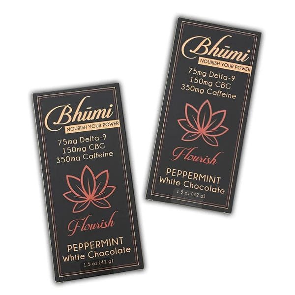 Bhumi’s Peppermint White Chocolate Bar combines the indulgent flavors of creamy white chocolate and refreshing peppermint with a powerful blend of cannabinoids and caffeine. This innovative bar features 75mg of Delta-9 THC, 150mg of CBG, and a caffeine boost of 350mg to provide a unique experience that combines relaxation, focus, and energy.