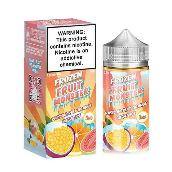 Discover Passionfruit Orange GuavaI Ice TFN E-juice by Frozen Fruit Monster – a delicious blend of exotic passion fruit, orange and guava with a refreshing menthol boost for a fantastic vape experience.