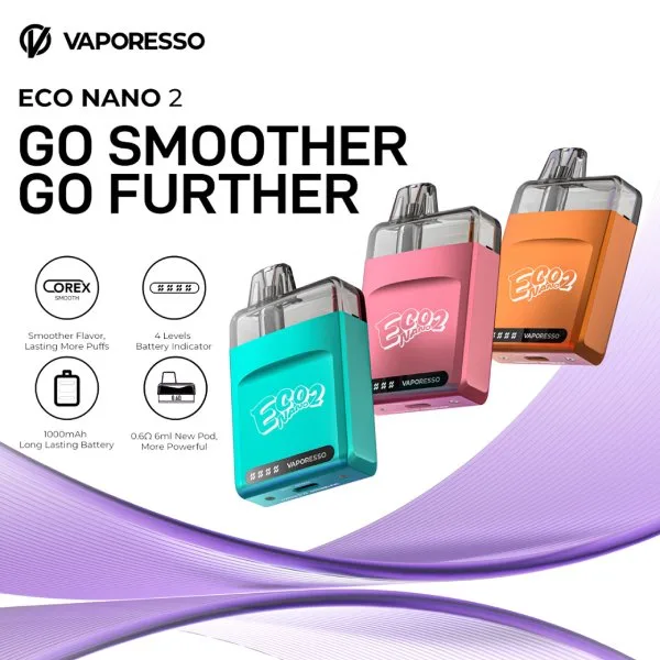 Discover the perfect balance between style and performance with the Vaporesso ECO NANO 2 Kit. The Vaporesso ECO NANO 2 Kit boasts a sleek and compact design, featuring a long-lasting 1000 mAh battery that can be recharged via a Type-C USB. Moreover, this top-notch vape pod kit has 6 ml of premium e-juice capacity, 0.6 ohm resistance with the COREX smooth heating technology, and an optimized cotton providing rich and delicate vapors up to 18000 puffs. Also, this Eco Nano 2 kit has a 4-level battery indicator and is compatible with the Eco Nano Pods, delivering versatile and intuitive vaping sessions. The Vaporesso ECO NANO 2 Kit consists of one ECO NANO 2 Battery and one ECO NANO 0.6 ohm MESH Pod (pre-installed) for your on-the-go advanced vaping sessions.